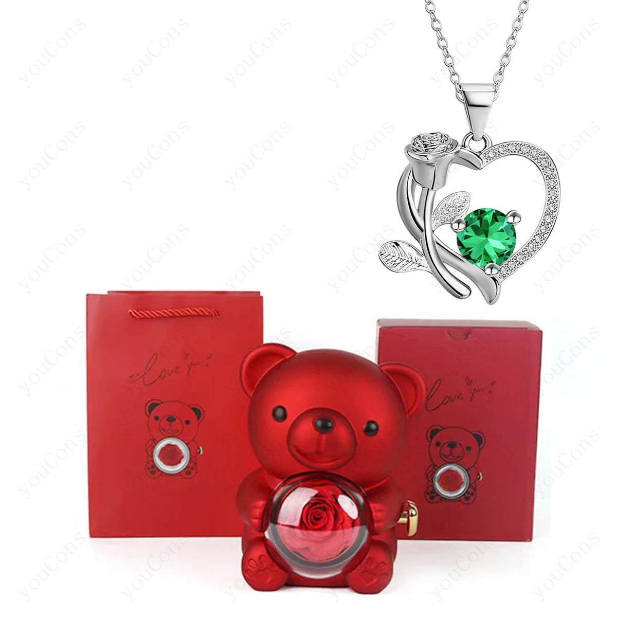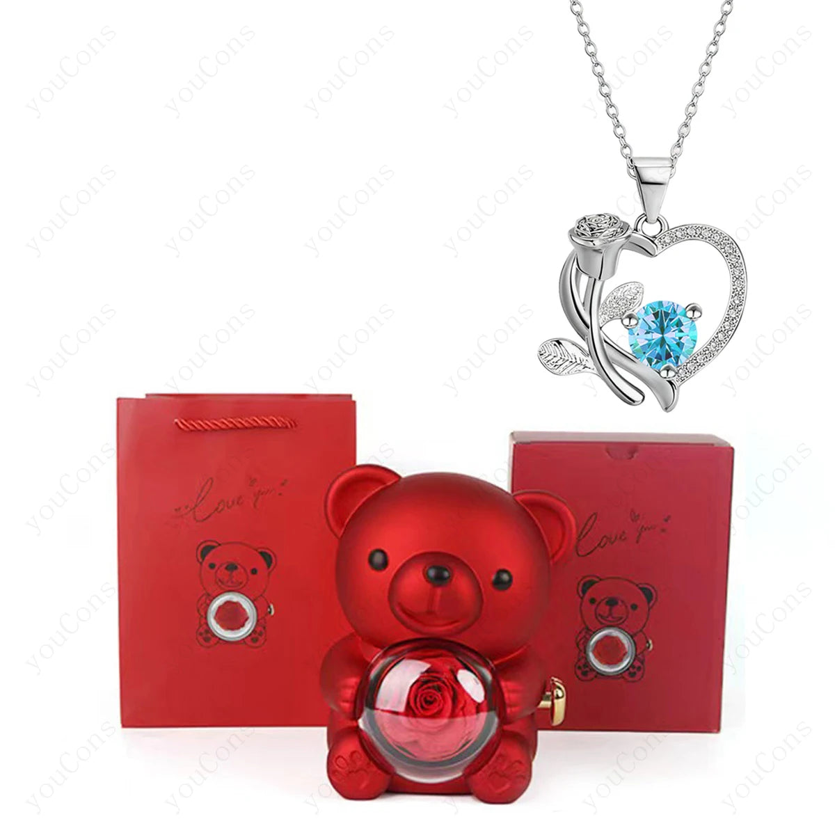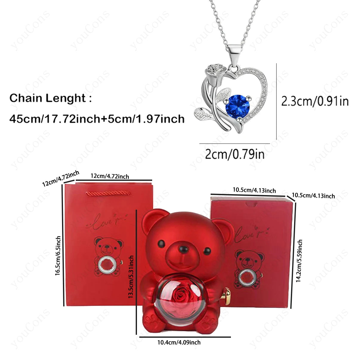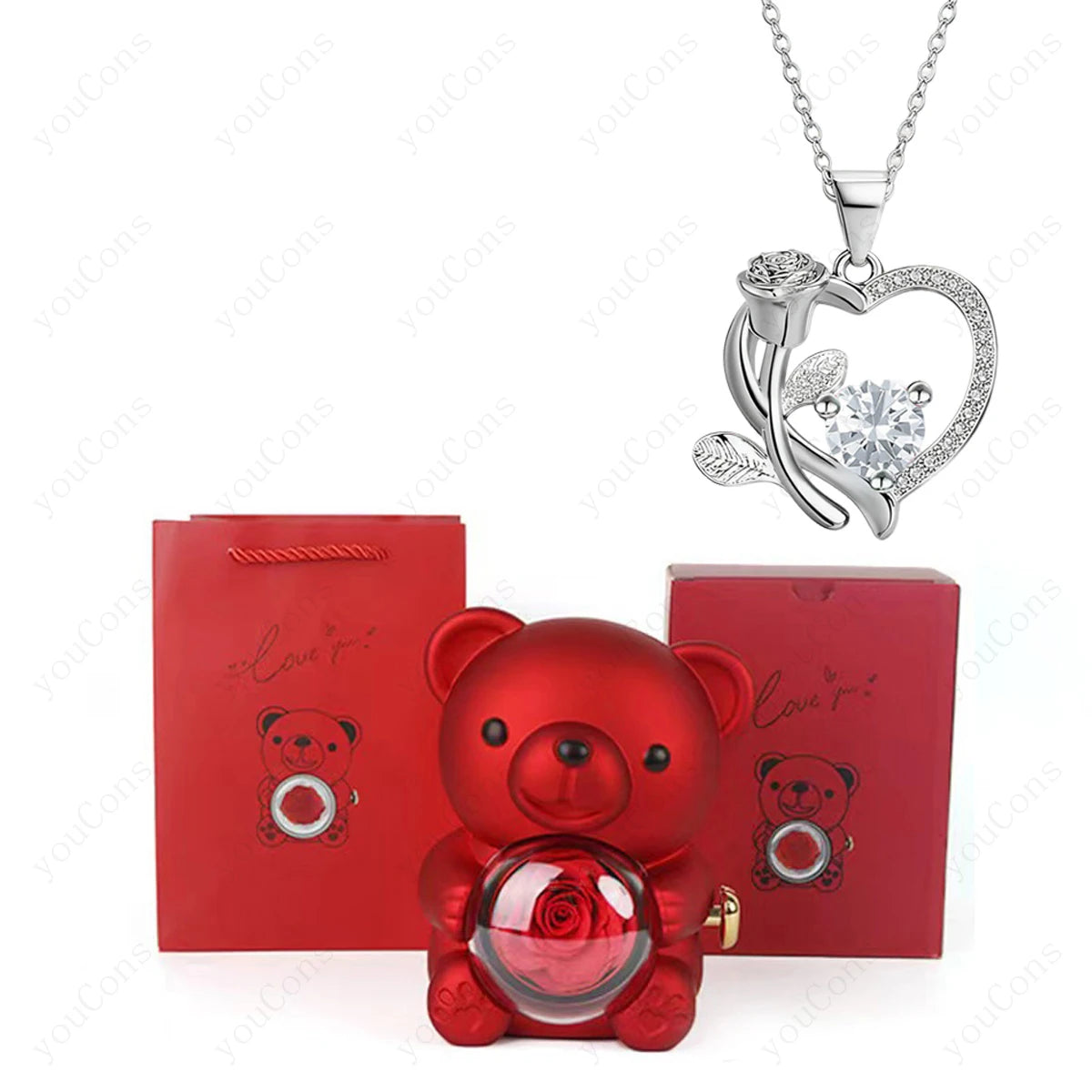 Il tenero orsacchiotto rosso custodisce una rosa decorativa racchiusa in una sfera trasparente, simbolo di amore eterno. All’interno è nascosta una splendida collana a forma di cuore, impreziosita da un brillante luminoso e da delicati dettagli floreali, che donano luce e raffinatezza al gioiello.